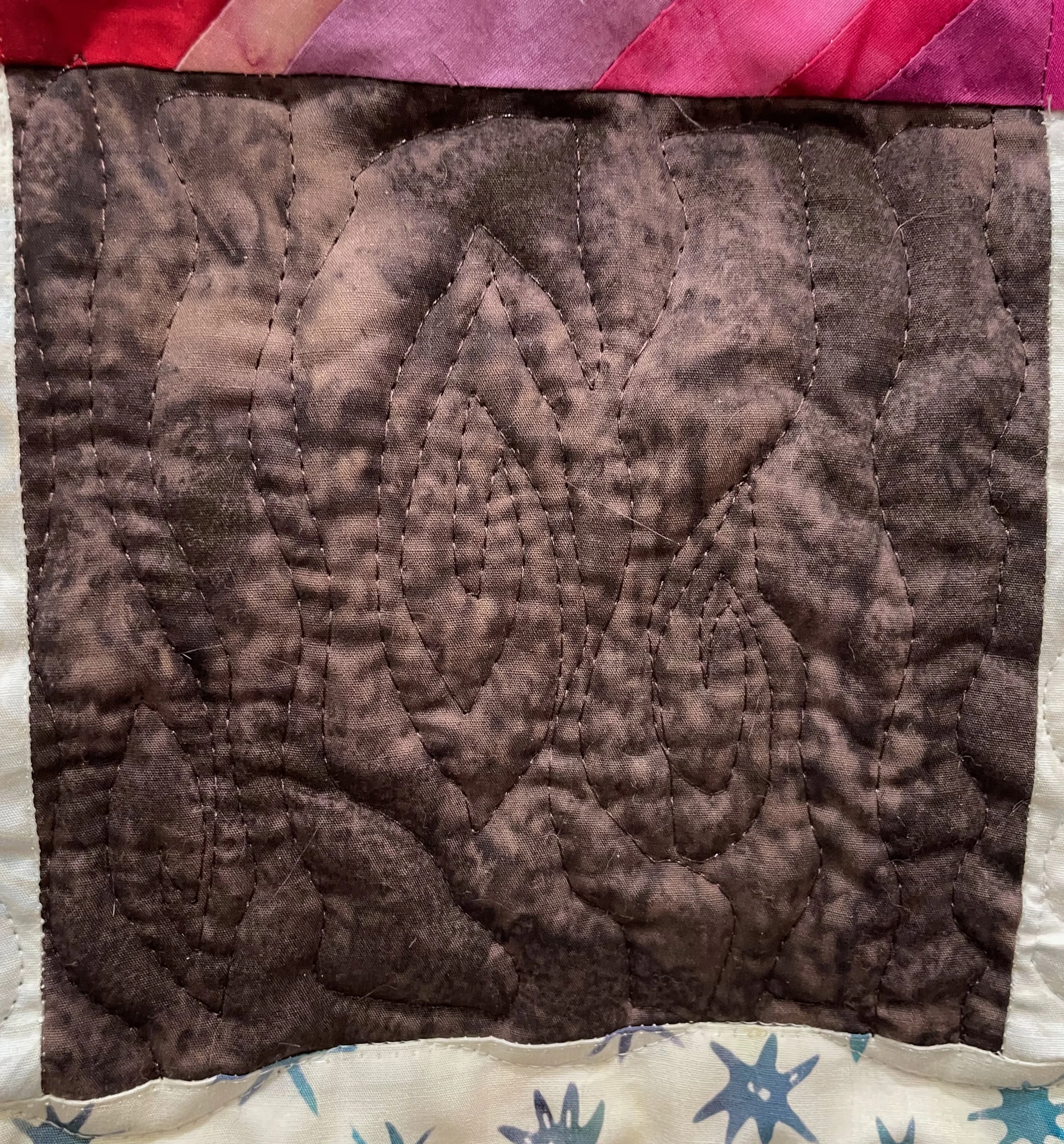 I used several different quilting motifs on this project: large wishbone for the tree, loops in the star and woodgrain in the tree trunk and then wavy lines in the first border and ls and es in the second one. Here are some detail images of the various quilting motifs.