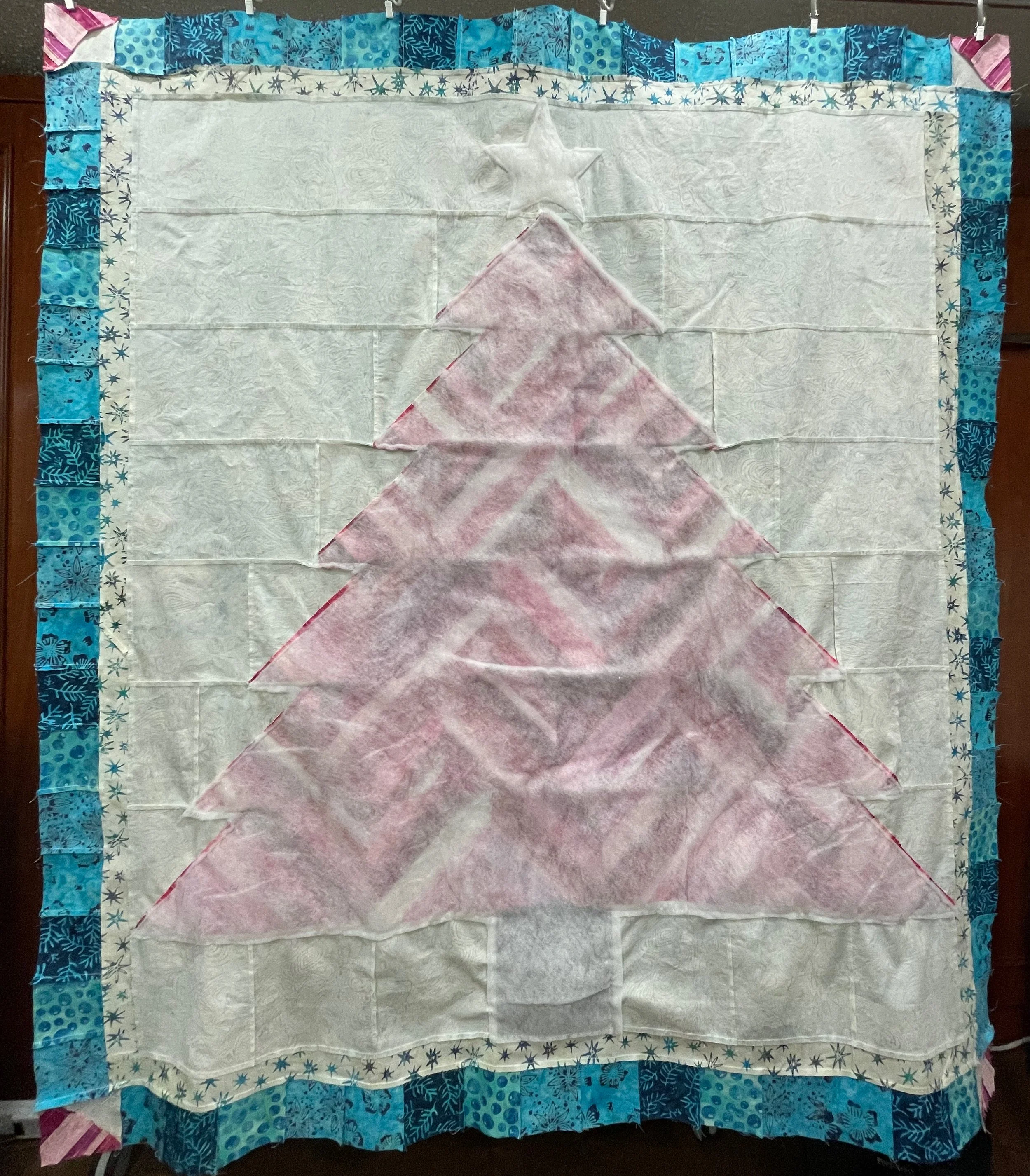 I decided to add faux trapunto to the tree, the tree trunk, and the star. This meant cutting out batting slightly larger than all these areas and I used Hobbs Poly-Down batting for this as I wanted to create additional “puffiness” with the faux trapunto. This batting was stitched to the back of these areas on the quilt top and then trimmed.