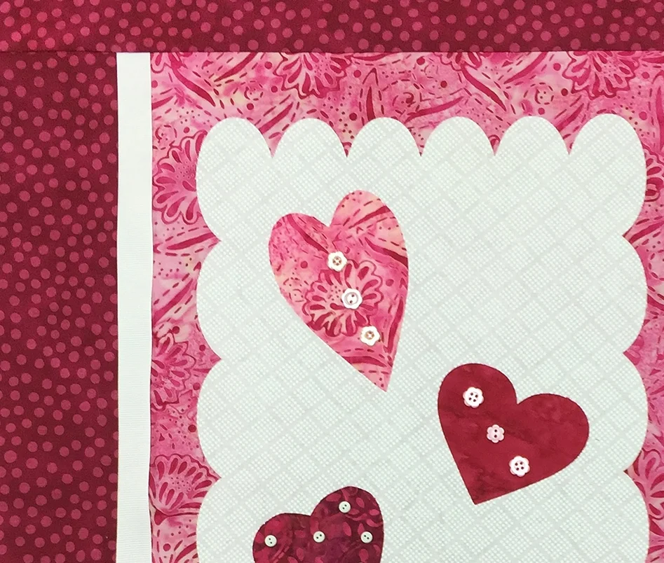 Then the fun part began: choosing the fabrics! I decided to go with batiks for the hearts and managed to find 4 different reds/pinks for them. I decide to stick with a white fabric for the scalloped appliqué background so the hearts would really contrast with it. I also chose the patterned pink batik for the layer under the scalloped background