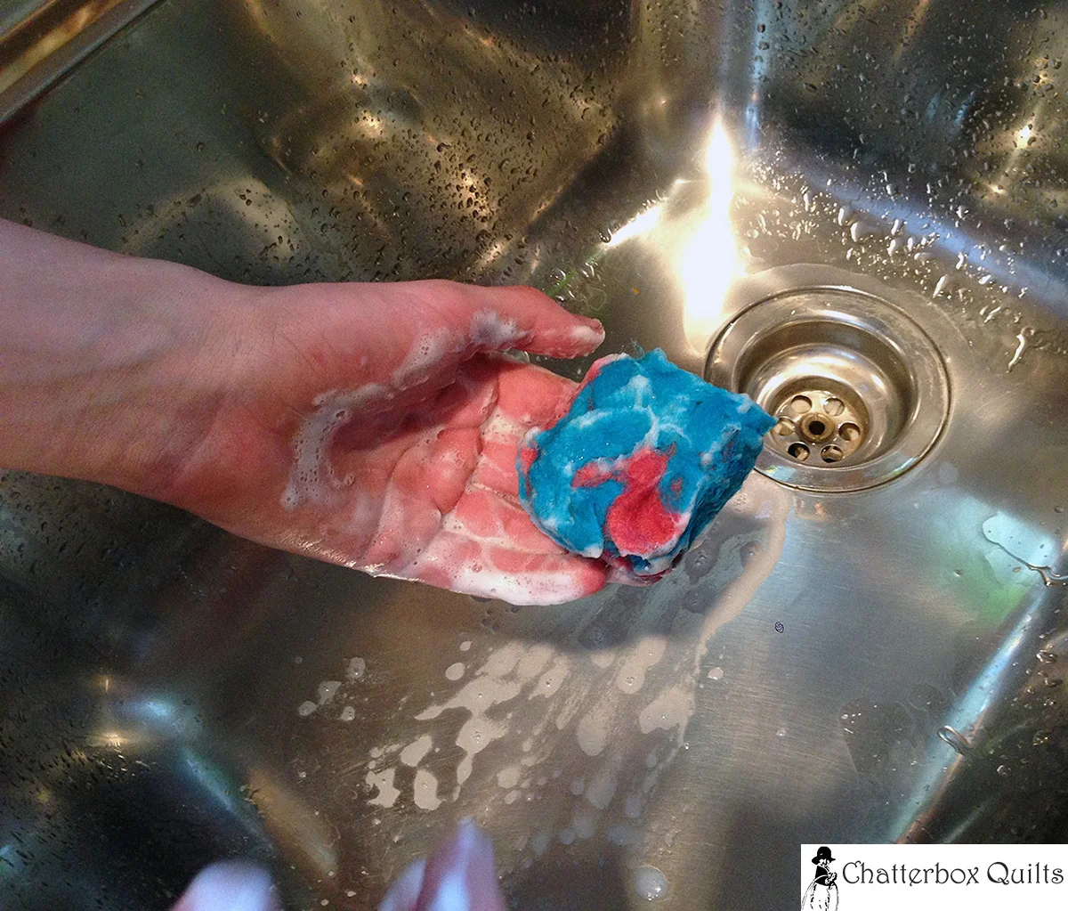 Once the wool roving is firmly bound to the soap (completely felted), rinse the soap in cold water and set it aside to dry. This may take some time, so you now have the opportunity to do some quilting or get a chocolate snack.